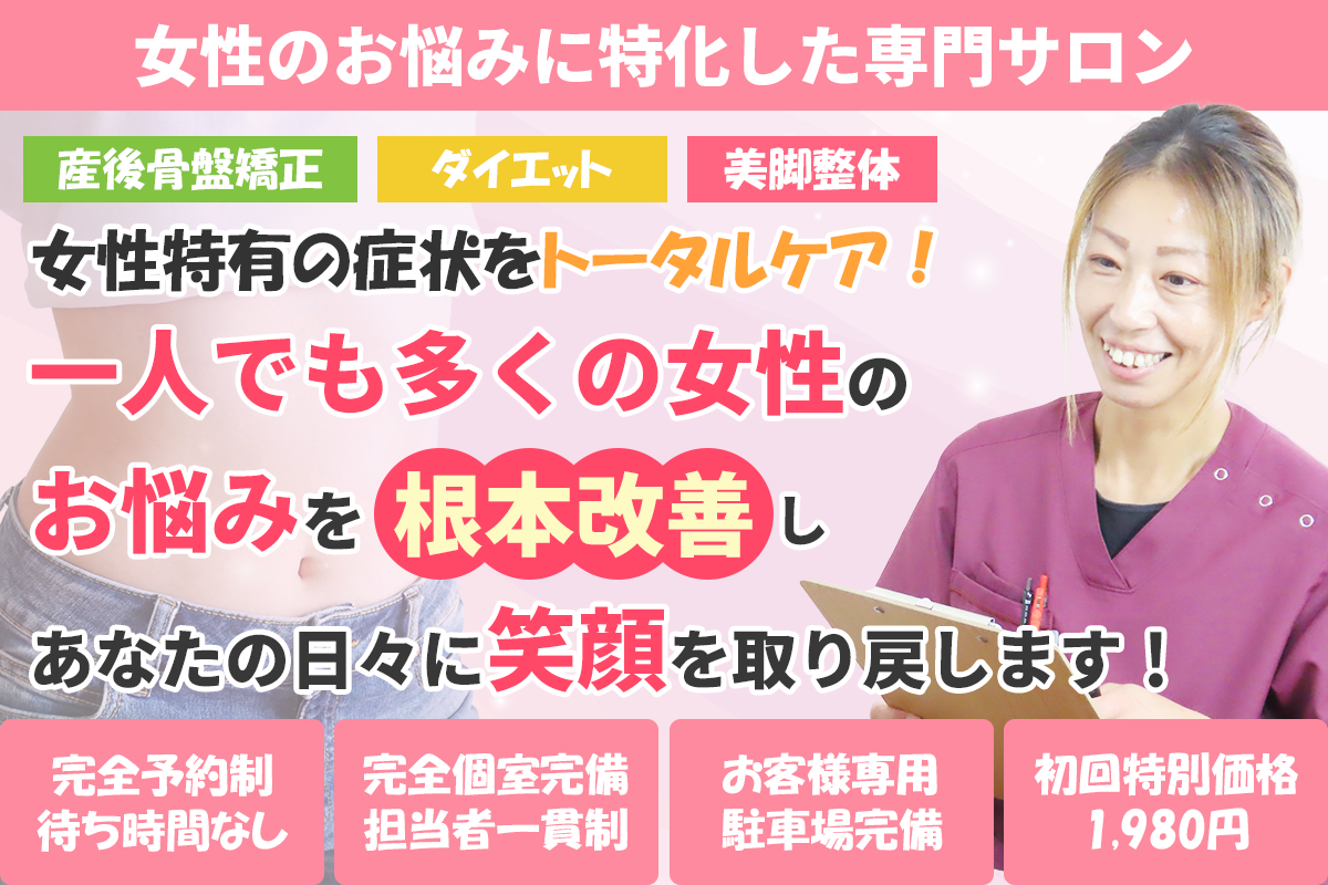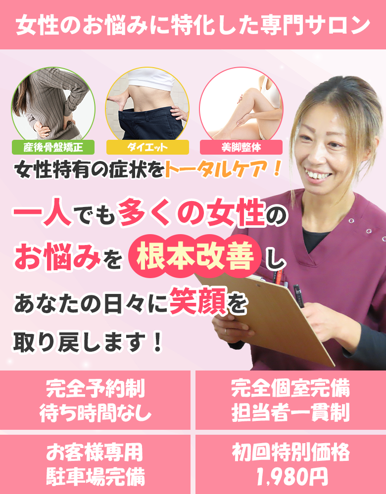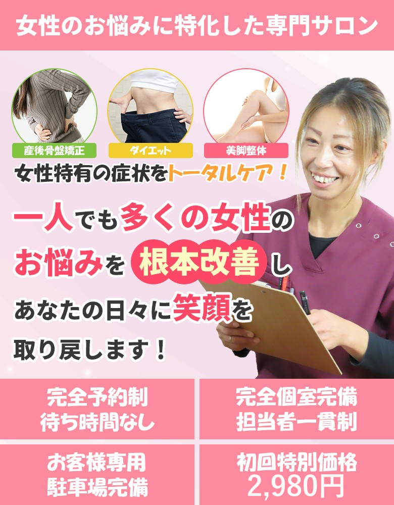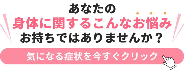 肩こり・腰痛・頭痛などの慢性的な症状はもちろん、当院ではむくみやダイエットのお悩みまで女性が持つ様々なお悩みに対応しております。