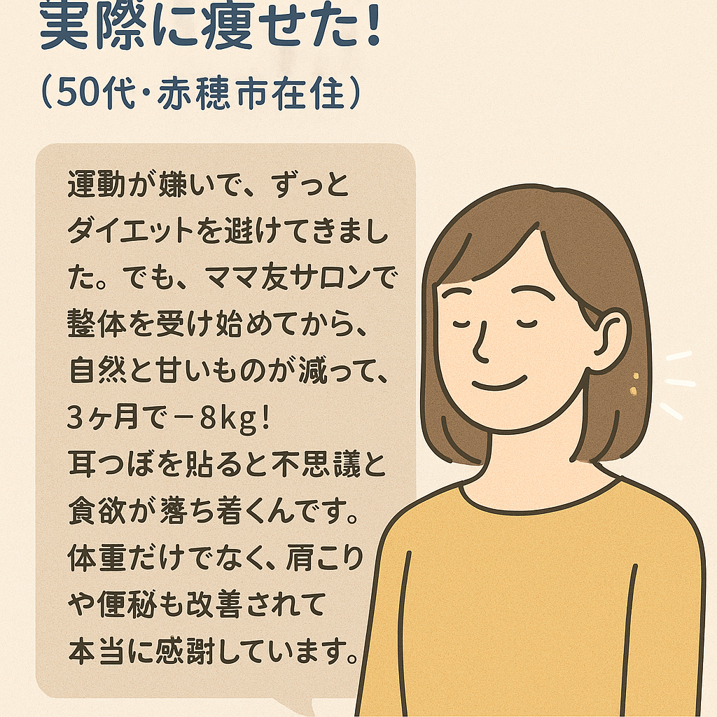 「運動が嫌いで、ずっとダイエットを避けてきました。でも、ママ友サロンで整体を受け始めてから、自然と甘いものが減って、3ヶ月で−8kg!耳つぼを貼ると不思議と食欲が落ち着くんです。体重だけでなく、肩こりや便秘も改善されて本当に感謝しています。」