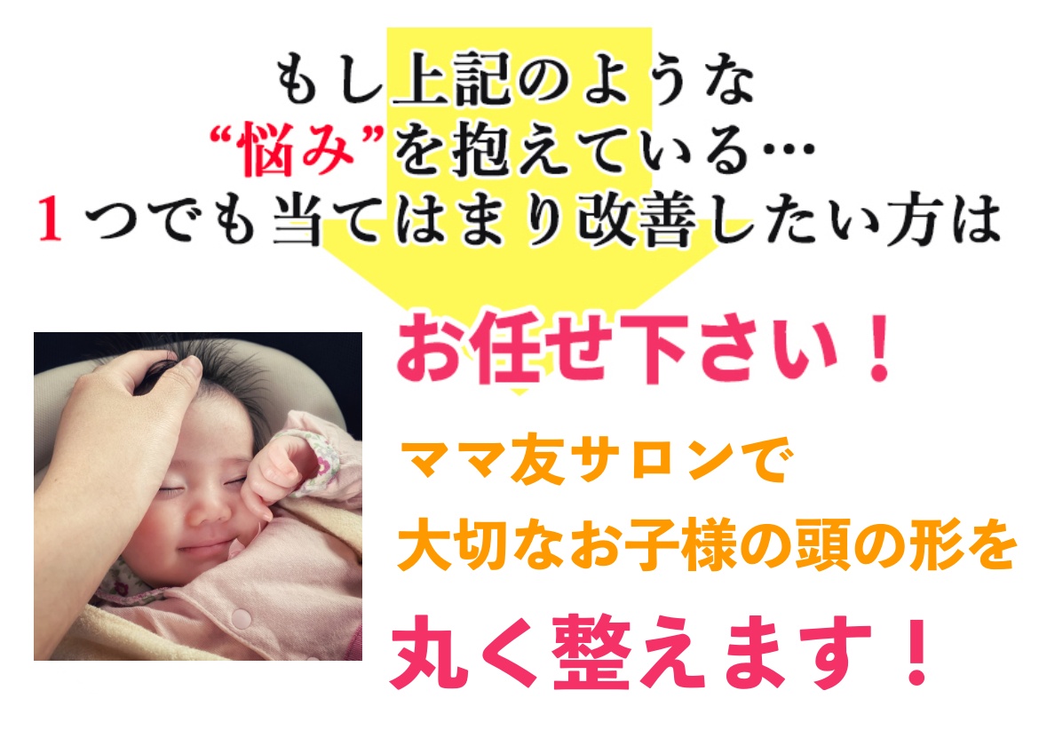 もしあなたが今上記のようにお悩みなら、もしあなたが少しでも良くしてあげたい!と思われているならママ友サロンに来院し、その「赤ちゃんの頭の歪み」の改善をしませんか?