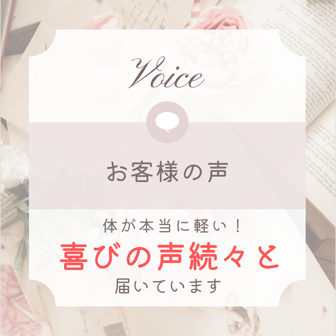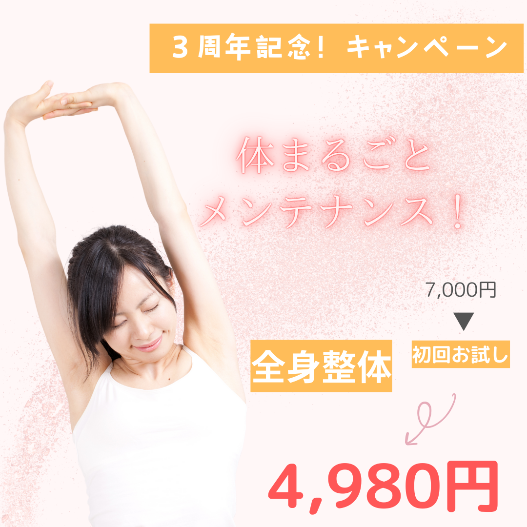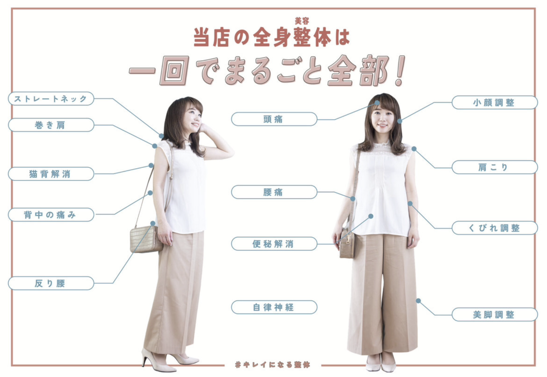 「女性が安心して通える整体」をご提供します。これまで3千人以上の方を施術した経験を活かし、女性のスタイルアップを得意としてます。もちろん、腰痛や肩こり、身体の不調など、その場で改善する「結果」にこだわった施術を心がけています。産後の骨盤矯正もお任せください!まずはお気軽にご相談下さいませ。