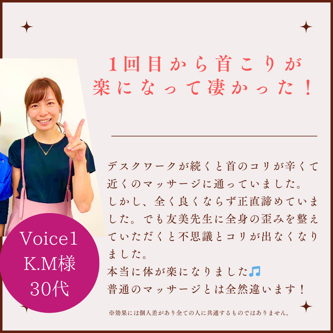 仕事や、家事、育児で忙しい毎日…疲れた体を定期的にケアしたい。「マッサージでは気持ちよくもんでもらうだけで姿勢を整えてはくれない」という女性の方へ。全身を調整する本格整体を一度お試しください。ソフトな施術なのに効果を一回で実感できる。同じ女性のお悩みを経験済みの女性スタッフによる本格整体。