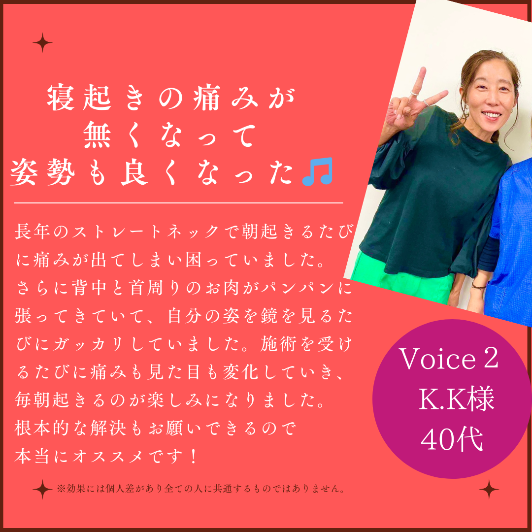 腰痛、肩こり、頭痛などの痛み改善はもちろんのこと、ストレートネック、反り腰、猫背、産後の骨盤矯正、小顔調整など、美しい姿勢改善もまるごと全部ご提供しています。痛みや疲れが取れて、ついでに見た目も良くなるって良いとは思いませんか?